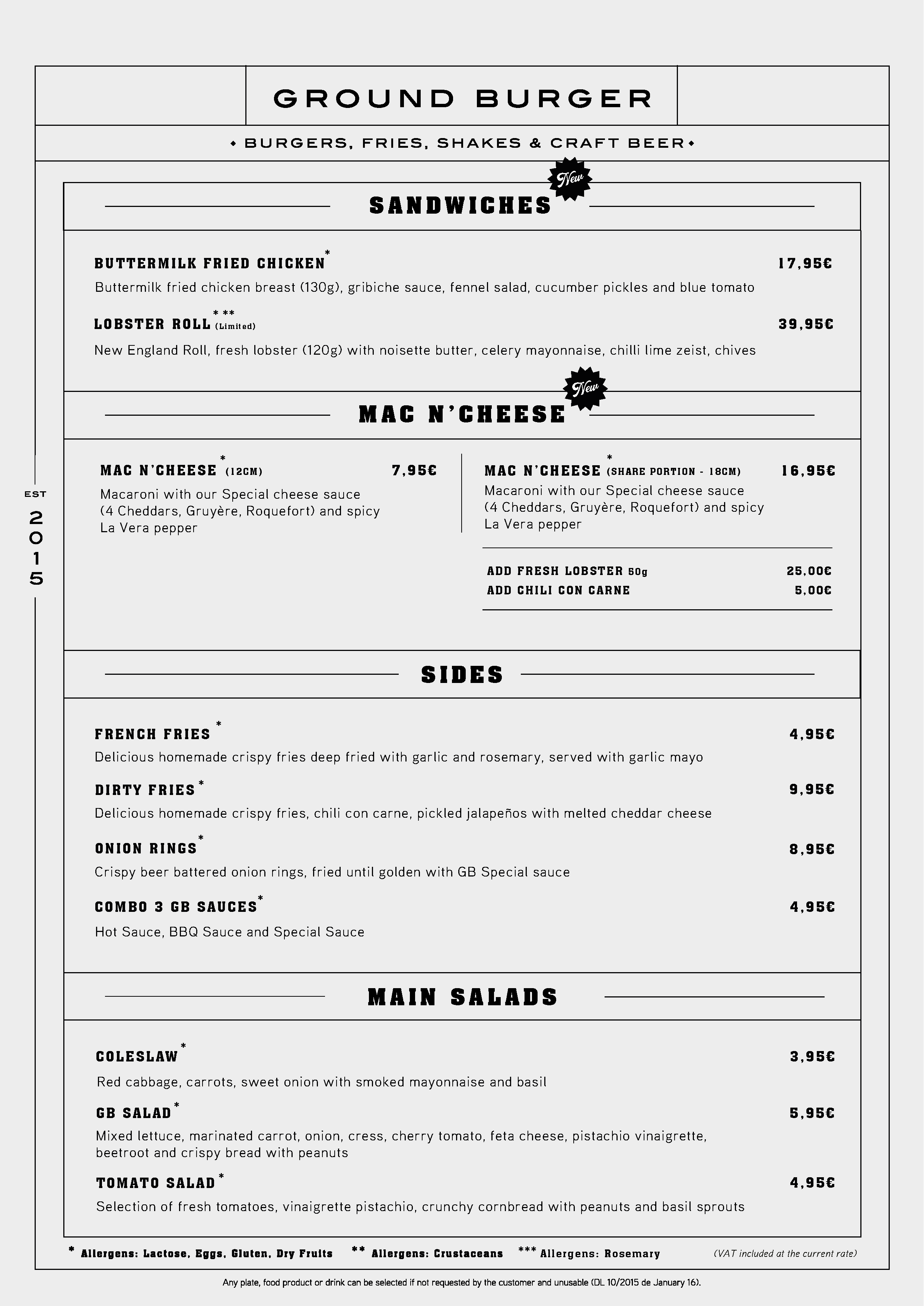 Cardápio de hambúrgueres artesanais com opções de carnes, queijos, vegetais e molhos, incluindo preços em euros.